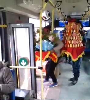 Lễ ăn hỏi bằng xe buýt gây xôn xao mạng (Ảnh cắt từ clip). |