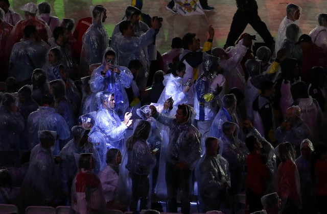 Thời tiết ở Rio có mưa, nhưng điều này không ngăn được người hâm mộ và VĐV vào sân Maracana để theo dõi lễ bế mạc Olympic 2016. |