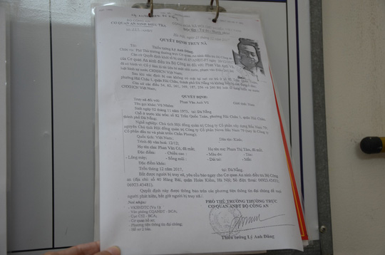 Trao đổi với PV Tuổi Trẻ, Đại tá Lê Văn Tam, giám đốc Công an thành phố Đà Nẵng, cho biết khi tiến hành đọc lệnh khởi tố bị can và tiến hành khám xét nhà ông Phan Văn Anh Vũ thì ông này không có mặt, cơ quan công an đã lập biên bản và ra quyết định truy nã. Vào thời điểm khám xét nhà, cả vợ con của ông Vũ “nhôm” cũng không có mặt.