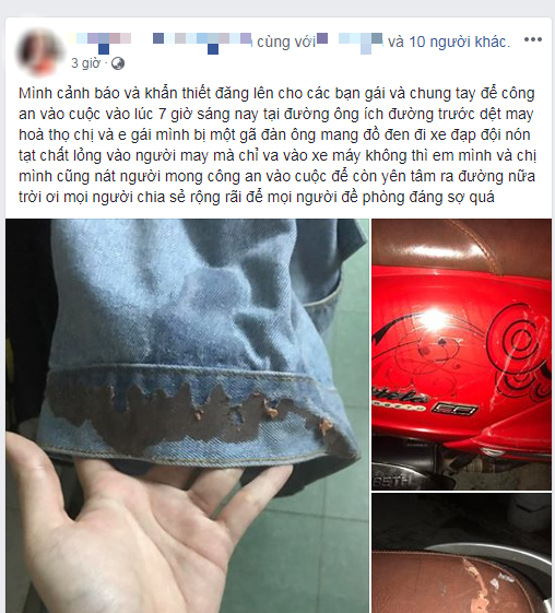 Trước đó, trên nhiều trang mạng xã hội ở Đà Nẵng liên tục chia sẻ các câu chuyện của nhiều thiếu nữ bị một người đàn ông tạt chất lạ vào người gây bỏng rát, hư hỏng tài sản.