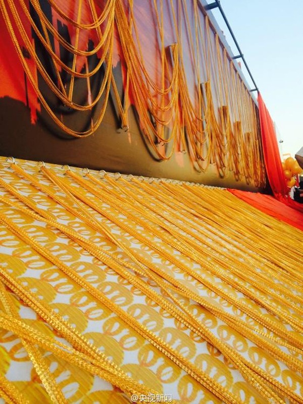 Sợi dây chuyền vàng, gồm hơn 4 triệu mắt xích từ vàng 22 carat, dài 5,52 km này là công sức của 100 người trong 45 ngày, với thời gian làm việc 10 tiếng một ngày, để kịp thời hoàn thành đúng tiến độ vào ngày 5/1 vừa qua.