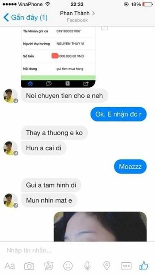Những tin nhắn qua lại giữa Thúy V. và Phan Thành cũng được chính Hot girl 17 tuổi này đăng tải lên trang cá nhân. Mặc dù xóa đi ngay sau khi đăng tải nhưng một số cư dân mạng đã nhanh tay chụp lại được và chia sẻ với tốc độ chóng mặt.