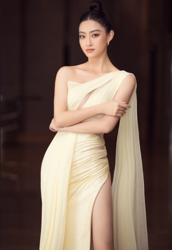 Lương Thùy Linh là một trong những nàng hậu có màn catwalk đỉnh cao trong vai trò của một vedette. Cô diện bộ váy vàng với thiết kế xẻ cao đầy táo bạo, phô diễn đôi chân dài 1m22.