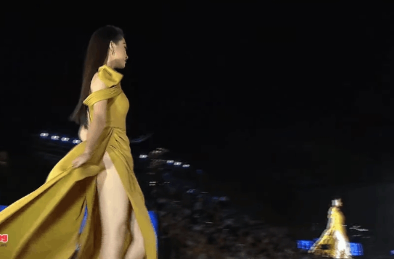 Nếu nhìn phía trước thì thiết kế cực kỳ tôn dáng và không hề có bất kỳ vấn đề nào, nhưng với góc quay ngang hay khi nàng Hậu xoay người tiến vào phía sau sân khấu thì đường xẻ thực sự quá hiểm hóc. Trong một góc máy quay từ dưới lên, nàng Hậu thực hiện động tác xoay người thì suýt chút nữa đường xẻ đã làm lộ vòng 3 của cô. Nhưng với sự chuyên nghiệp và kĩ năng trình diễn, Lương Thùy Linh đã nhanh chóng xử lý tình huống rất "mượt".