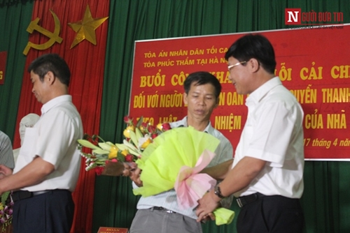 Đại diện phía TAND Tối cao tặng hoa chúc mừng ông Nguyễn Thanh Chấn.