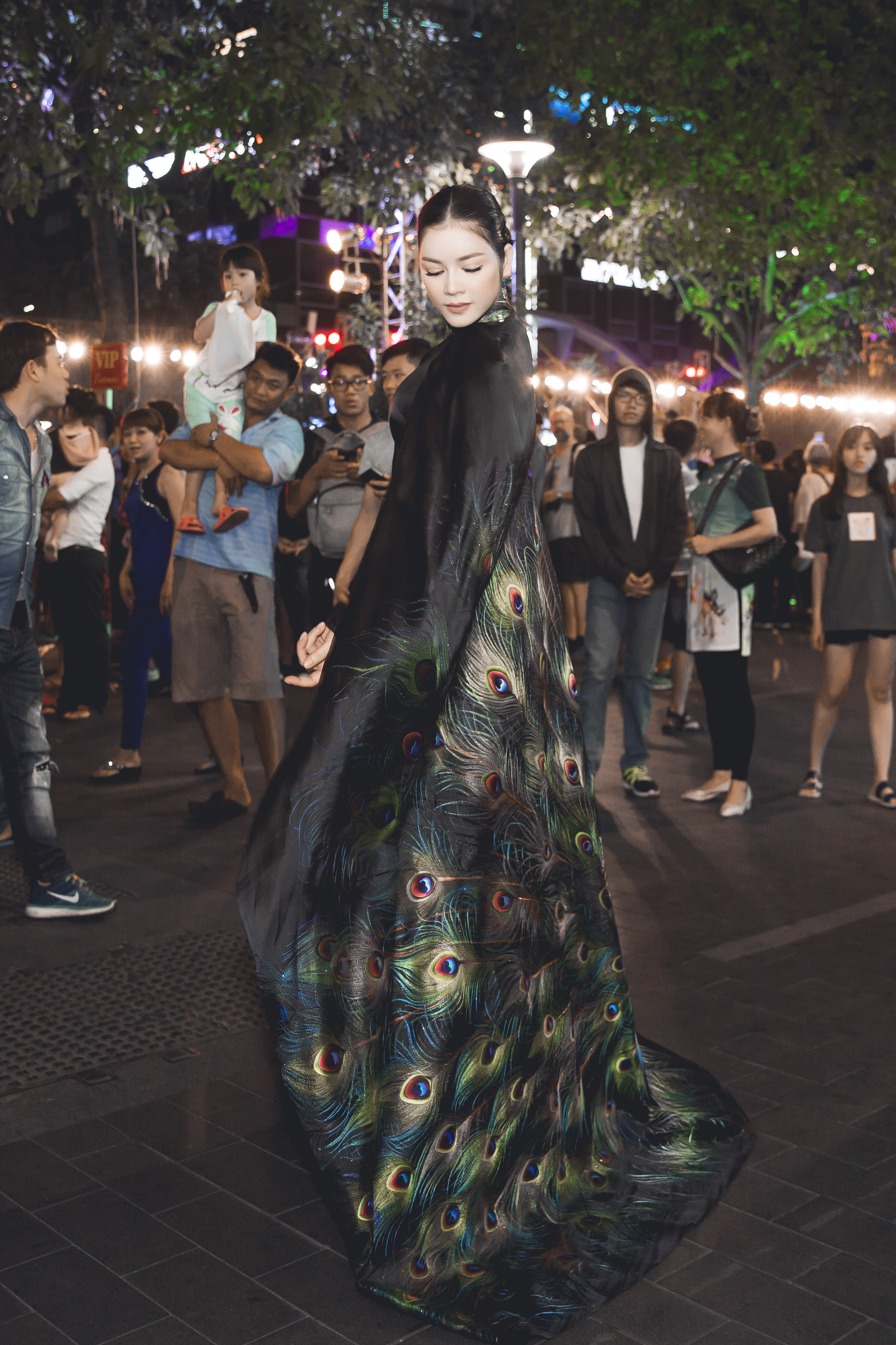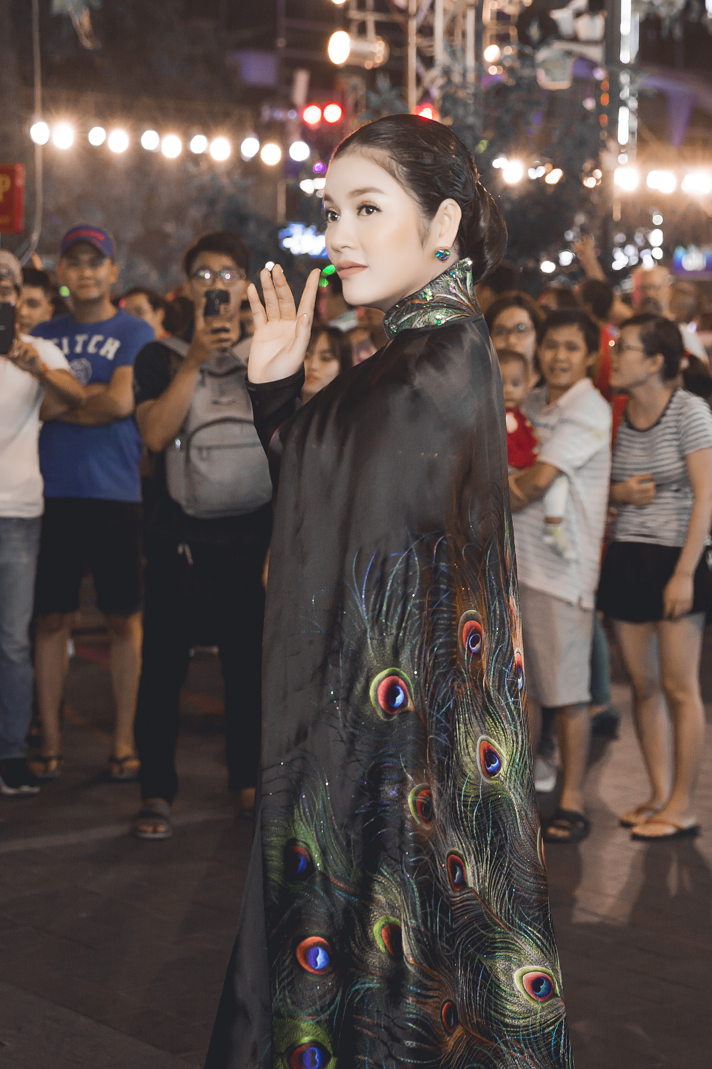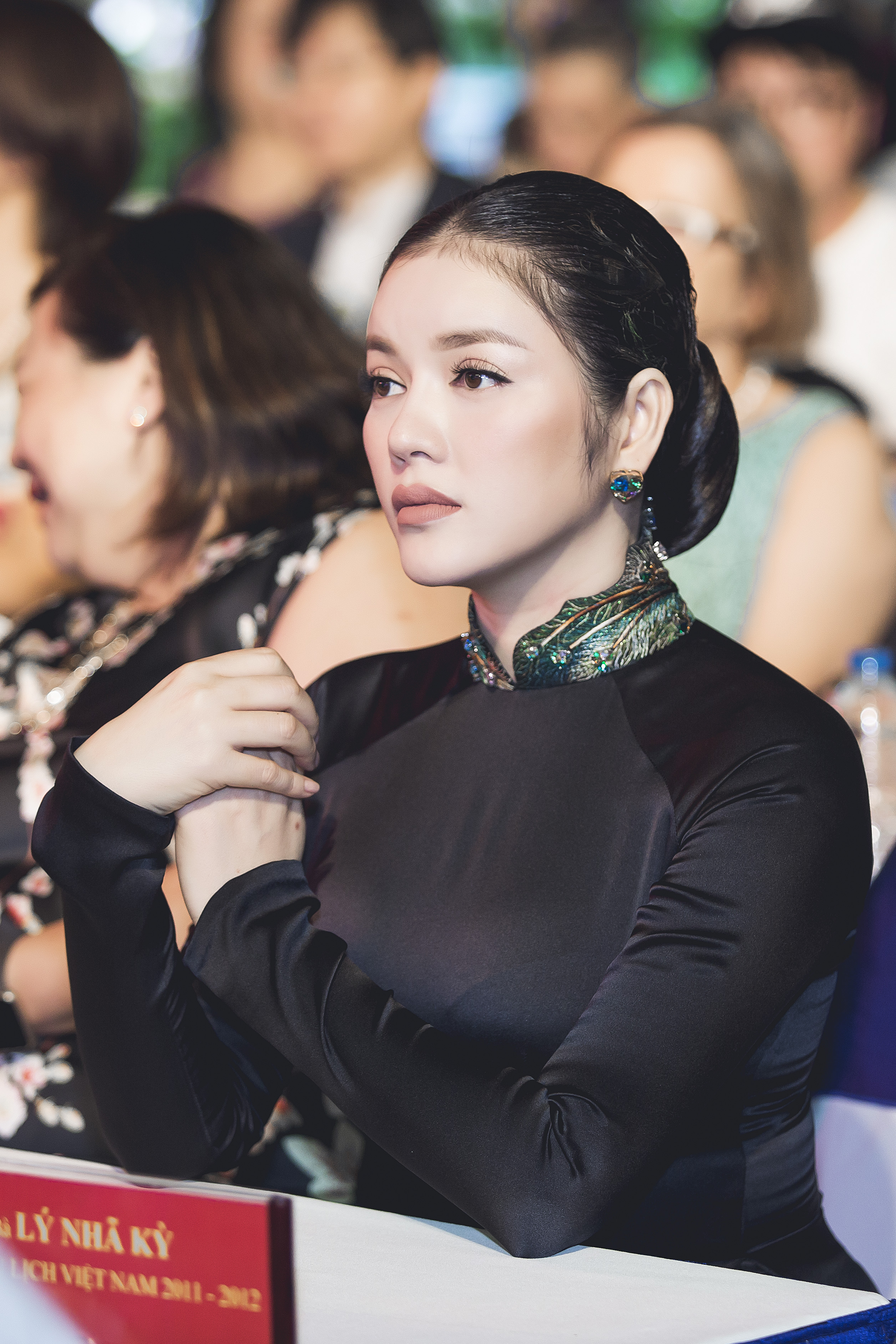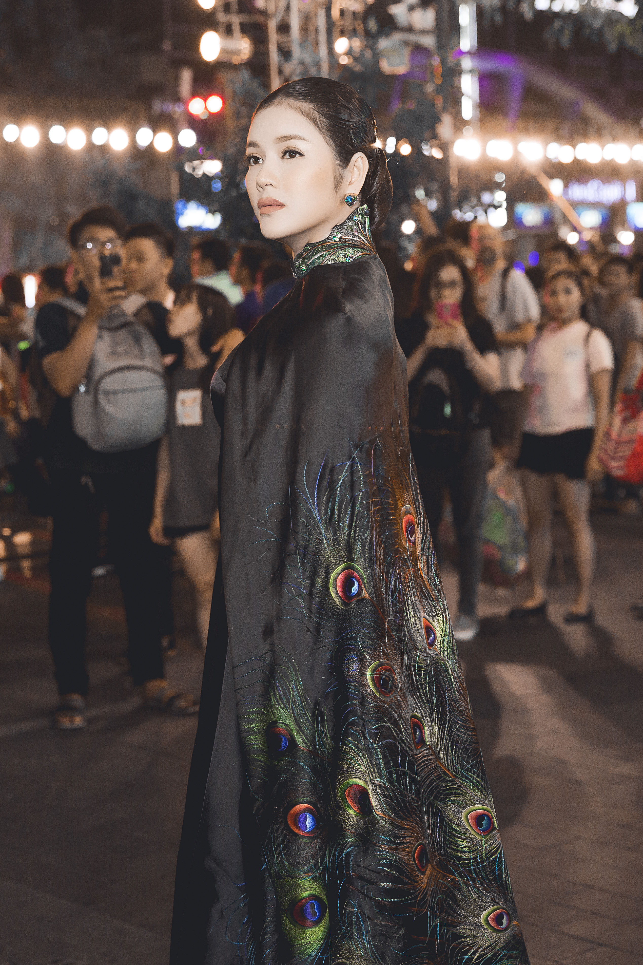 | Vẻ đẹp quý phái pha chút bí ẩn của Lý Nhã Kỳ trong bộ áo dài chim công đen đã khiến nhiều người có mặt tại sự kiện không thể rời mắt. |