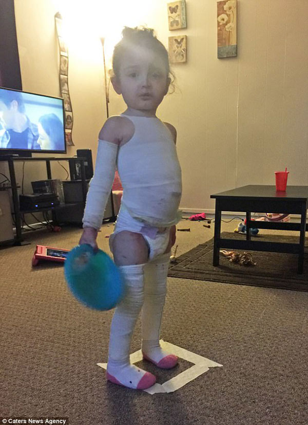 | Bé gái 3 tuổi đến từ Mỹ được đặt biệt danh là “xác ướp” vì toàn thân đều phải quấn băng do căn bệnh nghiêm trọng về da. |