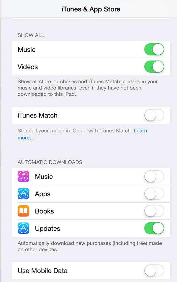 App Store sẽ tự động download và cài đặt các bản cập nhật khi thiết bị ở chế độ chờ nhưng nếu bạn không quá quan trọng việc phải cập nhật kịp thời ứng dụng thì bạn có thể tắt tính năng này tại Settings > iTunes and App Store > kéo xuống phần Automatic Downloads và tắt "Updates". Tại đây, bạn cũng có thể yêu cầu hệ thống không sử dụng kết nối 3G cho tính năng tự động download và iTunes match streaming...