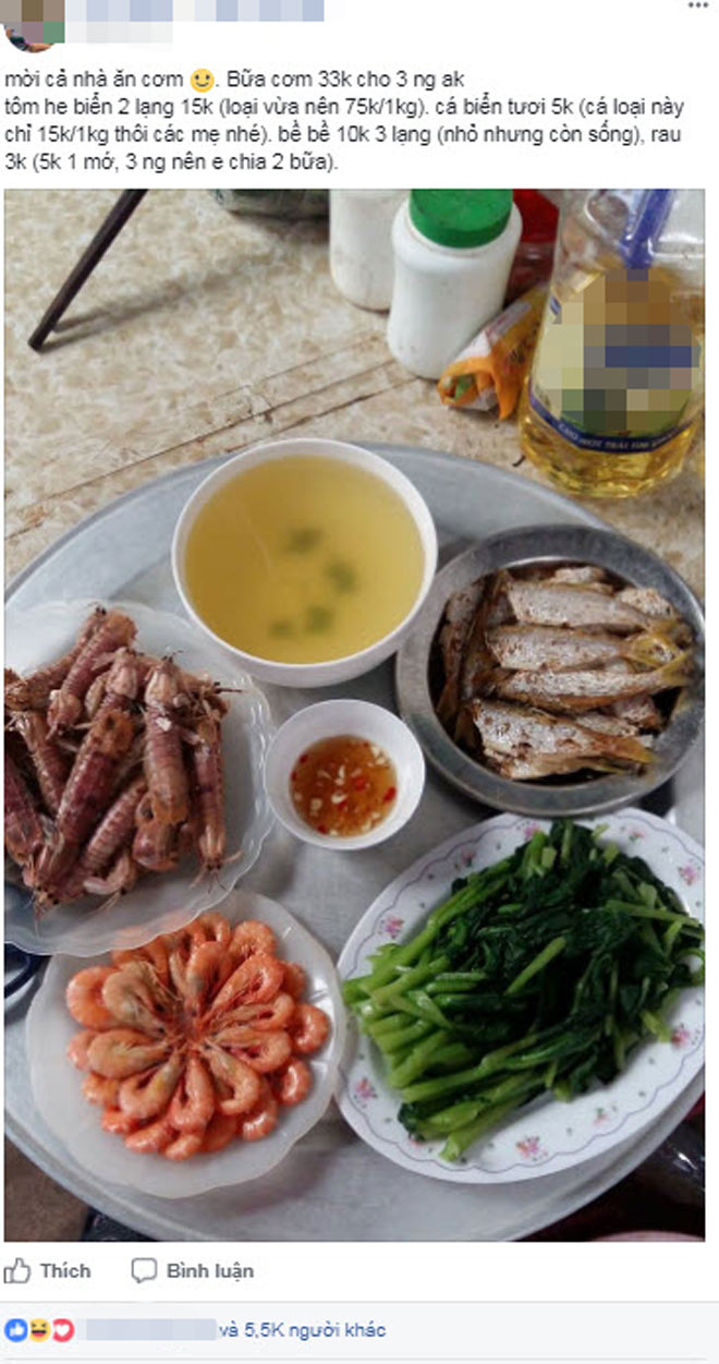 Chị T.H đã đăng tải hình ảnh mâm cơm đời thường lên mạng xã hội cùng chia sẻ: "Bữa cơm 33.000 đồng cho 3 người ăn. Gồm tôm biển 2 lạng giá 15.000 đồng, cá biển tươi 5.000 đồng (15.000 đồng/ký), bề bề 10.000 đồng/ 3 lạng, rau 3.000 đồng (5.000 đồng/bó)."