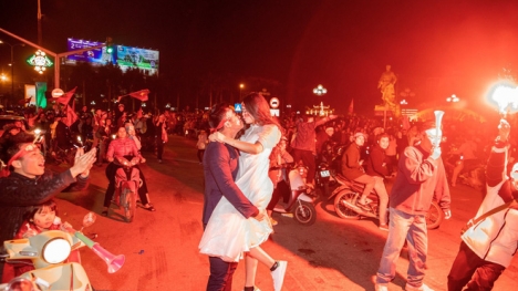 Bộ ảnh cưới có một không hai của đôi uyên ương này ngay lập tức nhận “bão like” của dân mạng khi được chụp ngay giữa dòng người đổ ra đường mừng Việt Nam vô địch AFF Cup 2018.