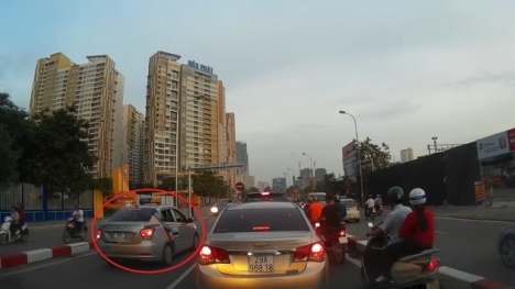Mặc dù đang trong giờ cao điểm, các phương tiện đang lưu thông dày đặc trên cầu. Thế nhưng một chiếc taxi BKS 30A - 803.07 của hãng VinaTaxi đã bất chấp, lấn làn đi ngược chiều để quay đầu.