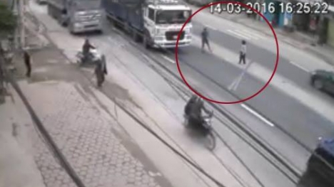Một thanh niên vác thanh sắt dài qua đường, chắn ngang cả làn đường. Khi xảy ra va chạm với chiếc xe tải, thanh niên này còn to tiếng với tài xế trên xe.