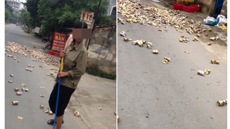Kỳ quặc người phụ nữ rải hàng trăm lon bia ra đường