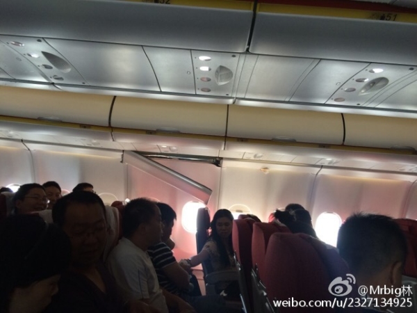 Một bức ảnh được hành khách chia sẻ trên mạng cho thấy một đoạn trần máy bay bị bung ra và lơ lửng trên đầu.