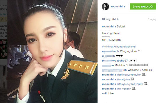 Sau một thời gian im hơi lặng tiếng vì scandal tình cảm với Chí Nhân, MC Minh Hà úp mở chuyện sẽ xuất hiện trong chương trình "Chúng tôi là chiến sĩ". Nữ MC đăng tải bức ảnh mặc đồng phục người chiến sĩ kèm theo dòng trạng thái “Salute. I'm so grateful” (tạm dịch: Xin chào. Tôi rất biết ơn). Đây là bộ trang phục của khách mời trong chương trình “Chúng tôi là chiến sĩ”.