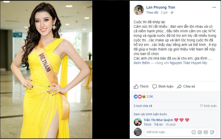 Đầu tiên, mẹ của Huyền My đã gửi lời cảm ơn đến những người đã giúp đỡ con gái trong thời gian vừa qua: "Cuộc thi đã khép lại: Cảm xúc thì rất nhiều, đan xen lẫn lộn nhau và có cả niềm hạnh phúc, đầu tiên mình cảm ơn các NTK trong và ngoài nước đã hỗ trợ em My rất nhiều trong cuộc thi, các make up và làm tóc trong cuộc thi đã hỗ trợ em, các thầy dạy tiếng anh và thể hình, ê kíp đã giúp em hoàn thành clip giới thiệu Việt Nam để nộp cho ban tổ chức. Các anh chị nhà báo đã ưu ái cho em, gia đình, bạn bè và các fan đã ủng hộ em hết mình và đặc biệt là ban tổ chức cuộc thi đã tốn nhiều công sức để giúp cuộc thi kết thúc 1 cách trọn vẹn".
