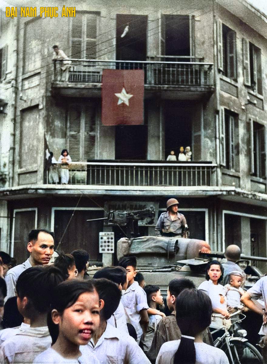 Lính Pháp trên xe tăng chuẩn bị rút khỏi Hà Nội cạnh một nhà dân treo cờ đỏ sao vàng.