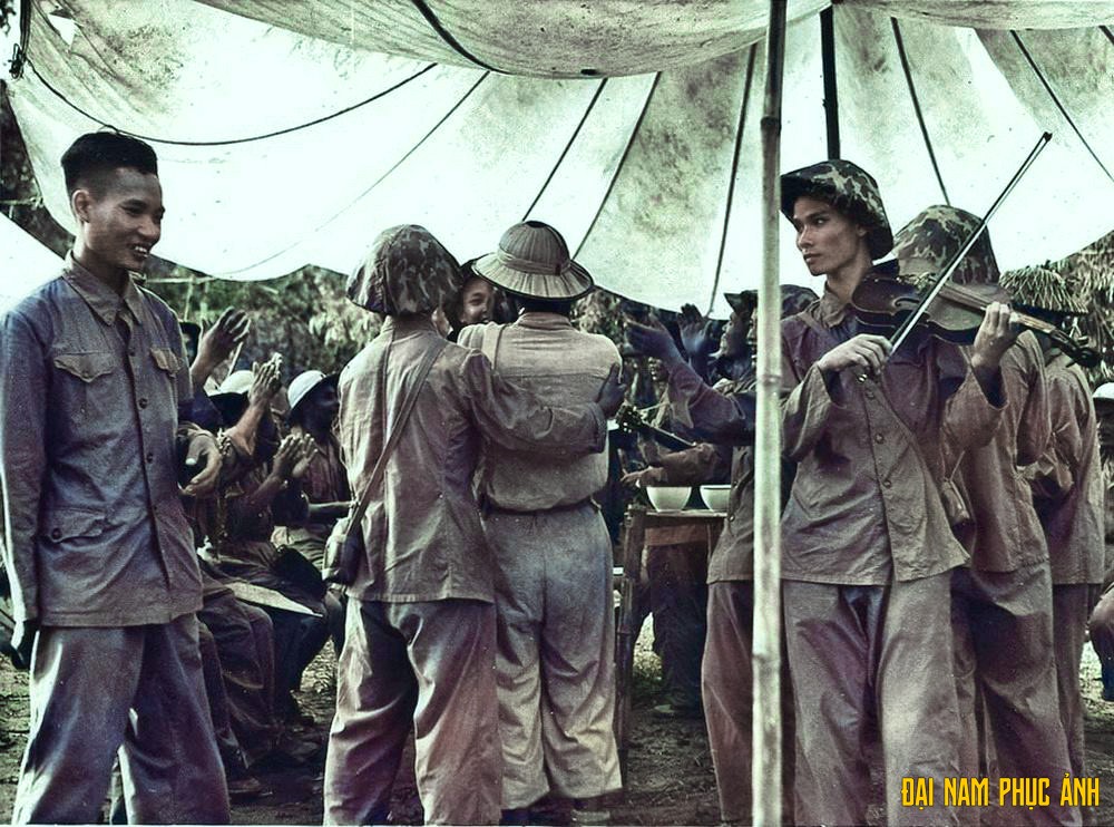 Các chiến sĩ Việt Minh liên hoan văn nghệ mừng chiến thắng.