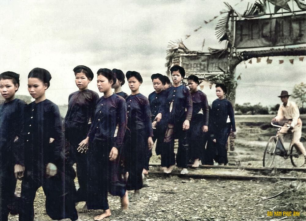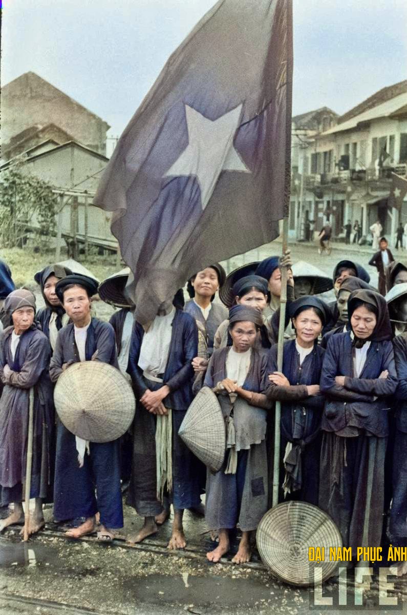 Đoàn phụ nữ ủng hộ Việt Minh bước qua cổng chào.