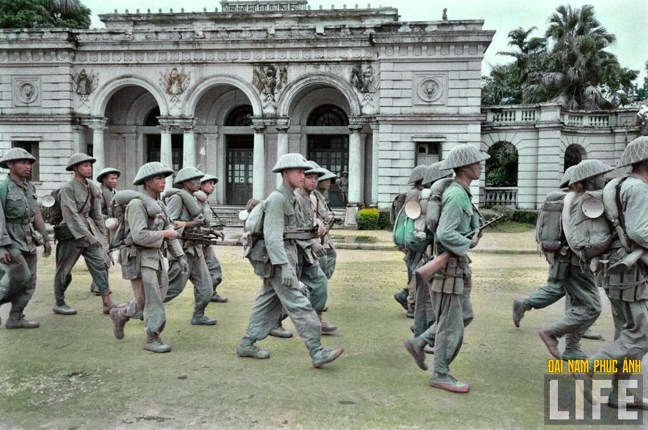 Bộ đội tiếp quản Hà Nội đi ngang qua trước cổng Dinh Toàn quyền Đông Dương.