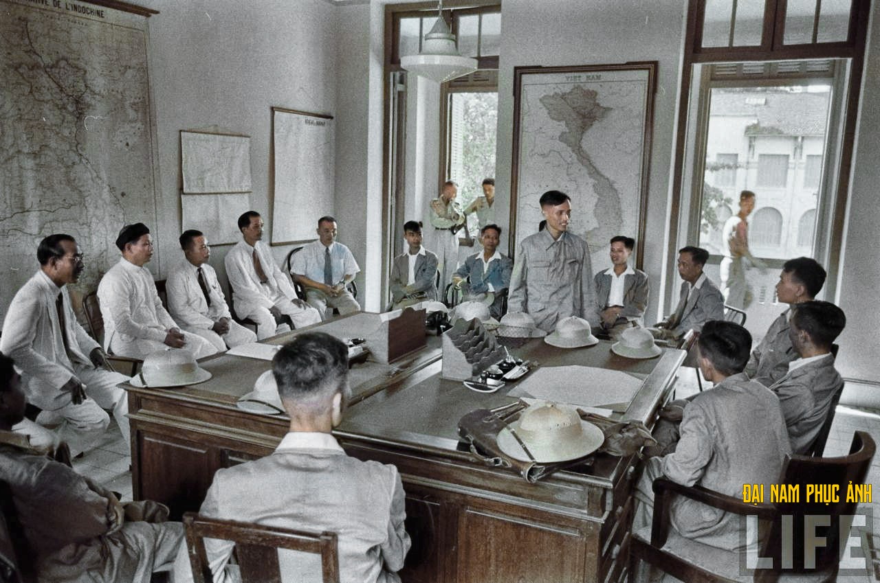 Đoàn cán bộ Việt Minh gặp các viên chức lãnh đạo Nha Giám đốc Bưu điện Bắc Việt để chuẩn bị việc tiếp quản cơ quan này.