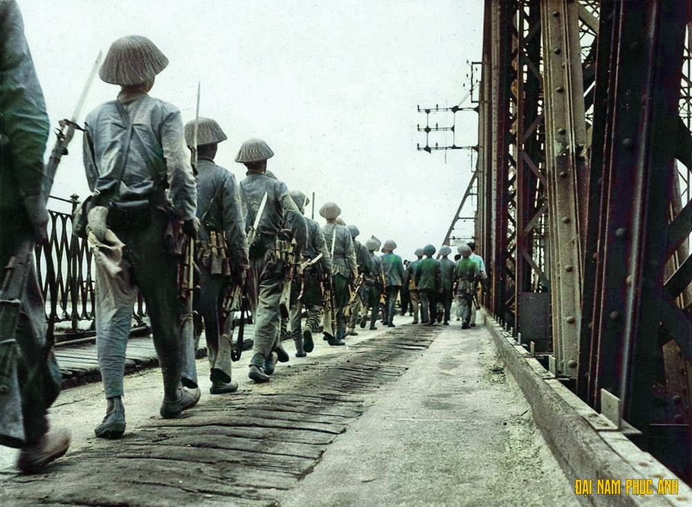 Đoàn binh lính Pháp rút lui khỏi Hà Nội qua cầu Paul Doumer, nay là cầu Long Biên.