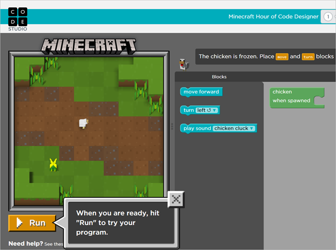 Được thiết kế cho các em trên 6 tuổi, phiên bản Minecraft Hour of Code Designer dạy học sinh tạo ra những trải nghiệm MineCraft riêng biệt, nơi các em tự lập ra luật chơi. Các em có thể tạo ra gà, ra vàng hoặc zombie để bỏ chạy, thay vì đánh nhau. Đồng thời, học sinh có thể sử dụng các giao diện lập trình kéo/thả quen thuộc của Code.org để tiếp thu các khái niệm căn bản trong khoa học máy tính, ví dụ như lập trình hướng đối tượng, quản trị sự kiện và các vòng lặp. Người chơi đối diện với loạt 12 mức chơi, gia tăng niềm vui nhờ có thể chia sẻ với bạn bè.