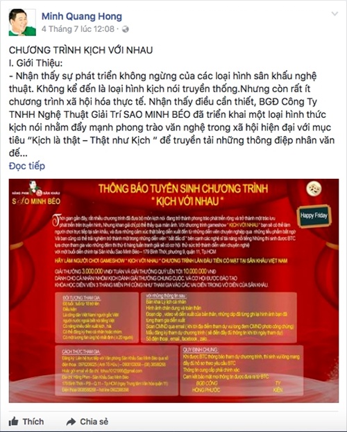 Mới đây, trên trang cá nhân, Minh Béo đăng tải thông tin tuyển thí sinh cho một game show mới do chính công ty của mình tổ chức với tên gọi Kịch với nhau. Chương trình nhằm mang phong trào văn nghệ phổ biến rộng rãi trong quần chúng, tuyên truyền thông điệp nhân văn. Kèm theo đó là lời mời gọi đây là sân chơi dành cho những tài năng không có cơ hội xuất hiện tại các chương trình truyền hình giải trí.