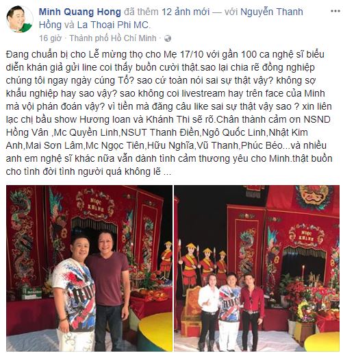 Trước thông tin này, Minh Béo lên tiếng chia sẻ: "Sao lại chia rẽ đồng nghiệp chúng tôi ngay ngày cúng Tổ? Sao cứ toàn nói sai sự thật vậy? Không sợ khẩu nghiệp hay sao vậy? Sao không coi livestream hay trên face của Minh mà vội phán đoán vậy? Xin liên lạc chị bầu show Hương Loan và Khánh Thi sẽ rõ. Chân thành cảm ơn NSND Hồng Vân, MC Quyền Linh, NSƯT Thanh Điền, Ngô Quốc Linh, Nhật Kim Anh, Mai Sơn Lâm, MC Ngọc Tiên, Hữu Nghĩa, Vũ Thanh, Phúc Béo...và nhiều anh em nghệ sĩ khác nữa vẫn dành tình cảm thương yêu cho Minh. Thật buồn cho tình đời tình người quá không lẽ ...". Không những thế, Minh Béo còn đăng hình ảnh mình chụp ảnh cùng nhiều nghệ sĩ để chứng minh.