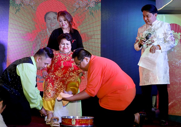 | Tiệc mừng thọ có cả phong tục rửa chân và chải tóc cho mẹ với những lời chúc thọ của 3 anh chị em Hồng Thủy Tiên, Hồng Phước Kiên, Hồng Quang Minh đã lấy đi bao nhiêu nước mắt của nhiều quan khách trên tàu cũng như đang xem trực tuyến trên thế giới. |