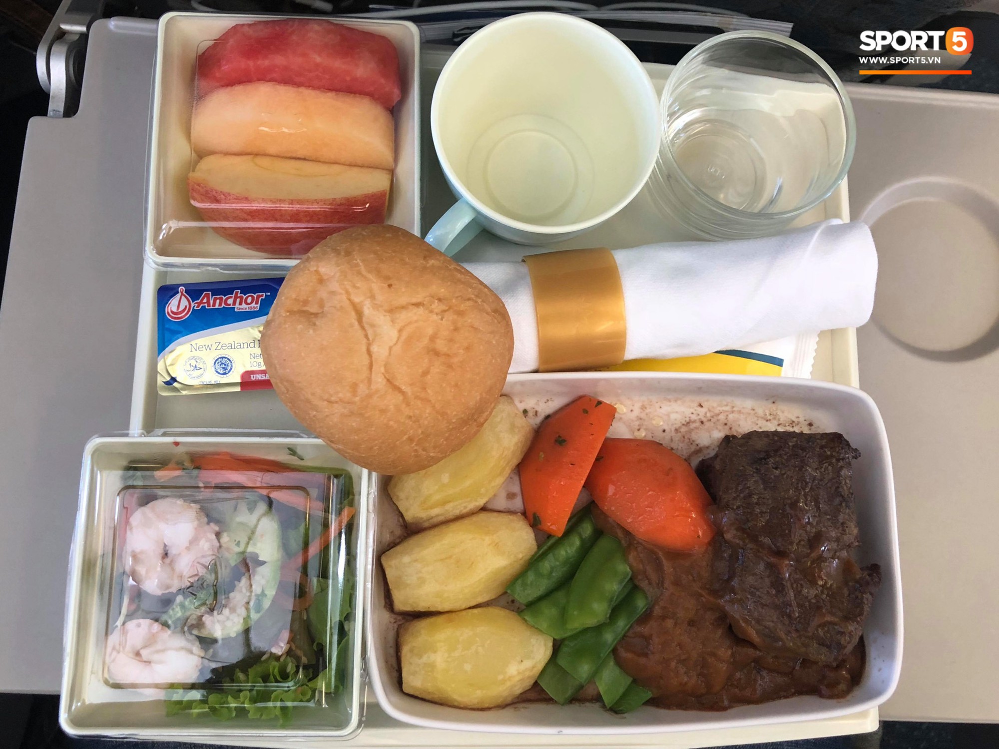 Trước đó, ở chuyến bay thẳng từ Hà Nội đi Bacolod, đội tuyển Việt Nam cũng được tiếp đãi suất ăn hạng thương gia với bò bít tết và cơm cá, ăn kèm với salad hải sản cùng táo tráng miệng.