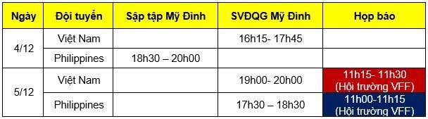 | Lịch tập của đội tuyển Việt Nam trước trận bán kết lượt về. Ảnh: VFF |