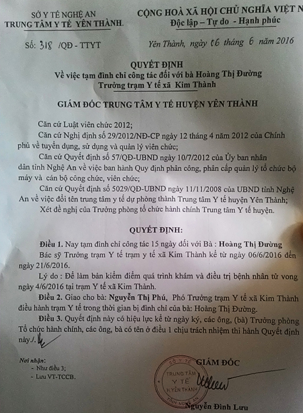 Quyết định tạm đình chỉ công tác đối với bà Hoàng Thị Đường - Trưởng Trạm y tế xã Kim Thành - Ảnh: Công lý |
