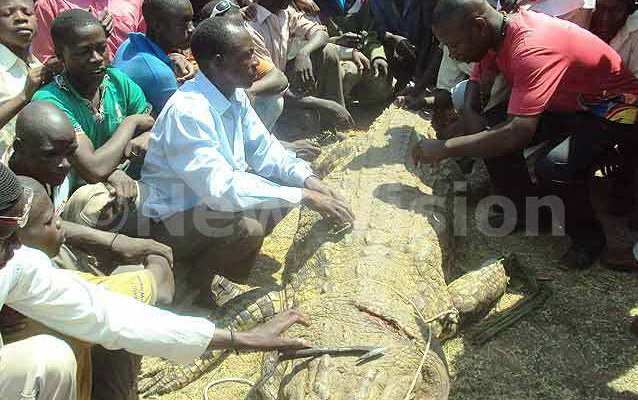 Dân làng bao quanh con cá sấu nặng một tấn bị ông Batambuze giết