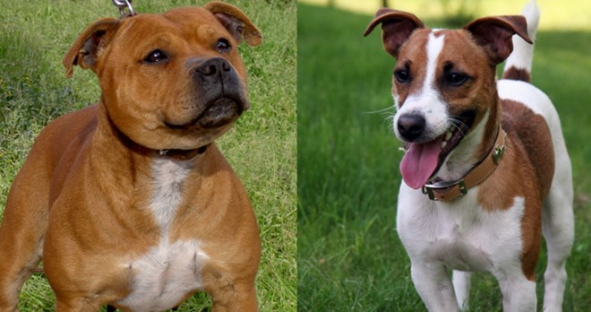 Hai con chó Staffordshire Bull Terrier và Jack Russell.