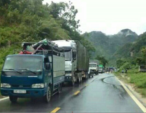 Hàng đoàn xe tham gia giao thông trên tuyến quốc lộ 6 bị tắc nghẽn do sạt lở đất. |