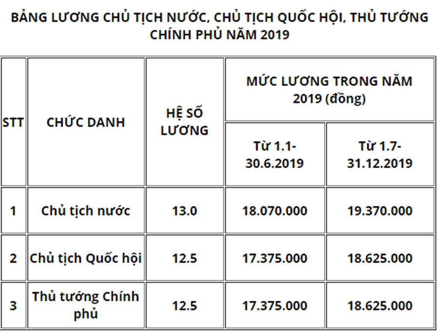 Với hệ số lương này mức lương của Chủ tịch nước là 18.070.000 đồng, mức lương của Chủ tịch Quốc hội và Thủ tướng Chính phủ đều là 17.375.000 đồng.