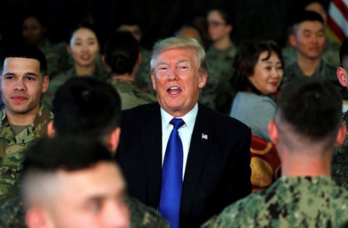Tổng thống Donald Trump dùng bữa với các binh sĩ tại Trại lính Humphreys ở Hàn Quốc ngày 7/11/2017. Ảnh: Reuters |