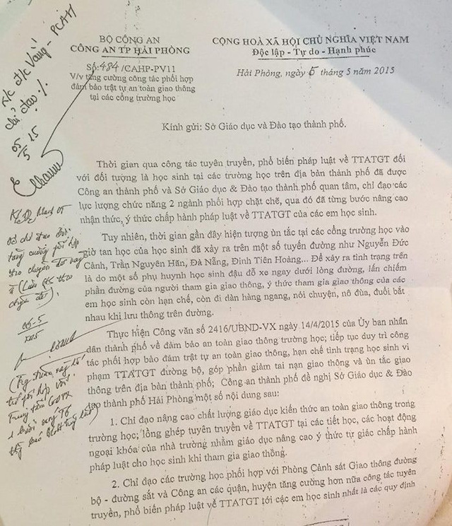 Thông tin thêm về vụ việc, báo Lao Động đưa tin ngày 5.5.2015, Công an TP Hải Phòng có văn bản gửi sở GD&ĐT TP về việc tăng cường công tác phối hợp đảm bảo ATGT tại các cổng trường học. Theo đó, công an TP Hải Phòng đề nghị sở GD &ĐT nâng cao công tác tuyên truyền, giáo dục về ATGT đến học sinh và phụ huynh, chấp hành các quy định về ATGT. Trong đó, văn bản yêu cầu, "mọi trường hợp vi phạm đều phải lập biên bản vi phạm hành chính và yêu cầu học sinh phải viết bản kiểm điểm có xác nhận của giáo viên chủ nhiệm và nhà trường, sau đó cùng người giám hộ đến cơ quan công an thì mới giải quyết theo quy định".