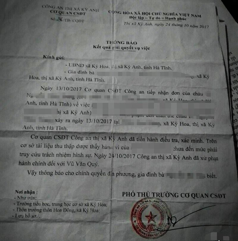 Cơ quan CSĐT đã tiến hành xác minh Quý đã sàm sỡ cháu bé, nhưng hành vi chưa đến mức phải truy cứu trách nhiệm hình sự. Ngày 24/10, Công an thị xã Kỳ Anh đã xử phạt hành chính đối với thanh niên này.