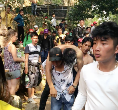 Sau khi bơi qua bên kia bờ, anh Thắng trèo lên vách đá, nơi thác nước đang đổ xuống thì bị trượt chân té ngã. Nạn nhân đã rơi từ độ cao hơn 3 m xuống nước tử vong.