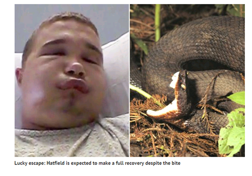 Nên đọcSau đó, Hatfield bị con rắn cắn vào mặt khi cố hôn vào đầu của nó. Cậu được đưa đến bệnh viện cấp cứu trong tình trạng nguy kịch. Con hổ mang sau đó cũng bị giết.