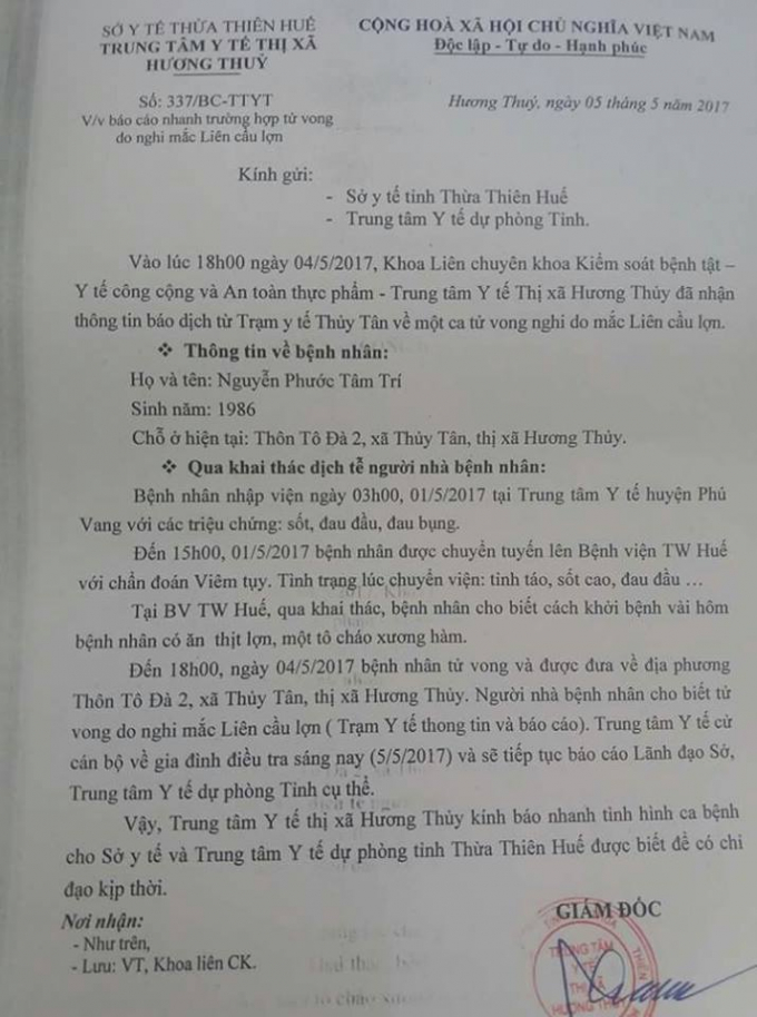 Thông tin trên báo Dân Trí cho biết, theo báo cáo của Trung tâm Y tế Thị xã Hương Thủy, tỉnh Thừa Thiên Huế gửi Sở Y tế tỉnh Thừa Thiên Huế về trường hợp một bệnh nhân tử vong nghi do mắc liên cầu lợn.