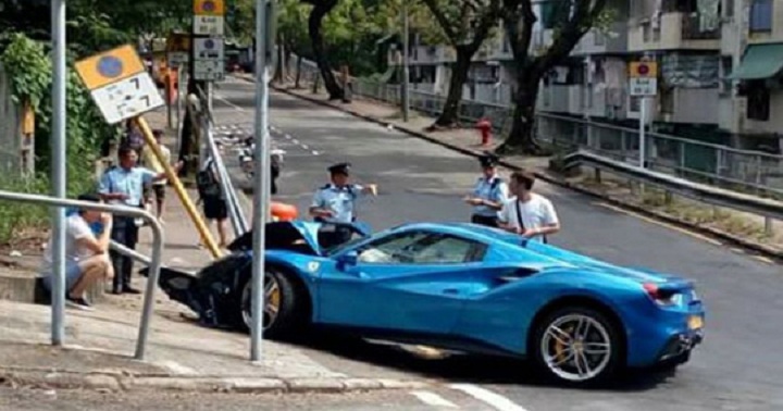 Theo South China Morning Post đưa tin, Chiếc Xe Ferrari màu xanh da trời, trị giá hơn 500.000 USD, đã móp hết đầu sau khi đâm liên tiếp vào ba tấm biển giao thông ở khu Aberdeen, tây nam Hong Kong vào chiều ngày 14/9.