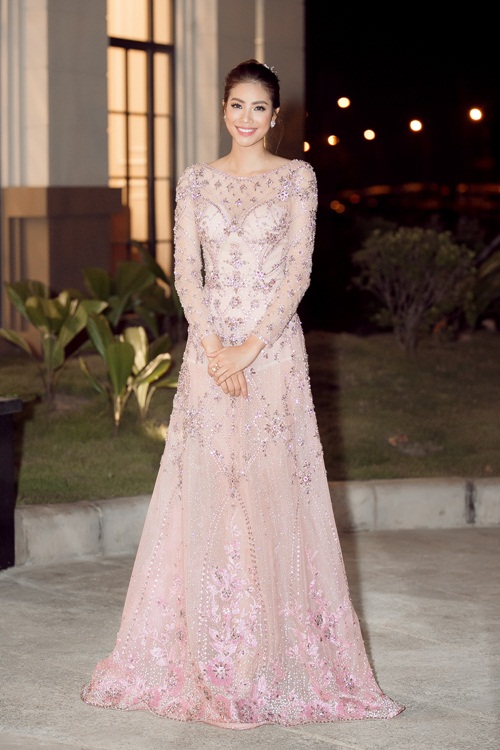 | Xuất hiện trong bộ đầm dạ hội màu hồng pastel được đính kết cầu kì với những viên đá lấp lánh đã giúp Phạm Hương cực kì nổi bật trong sự kiện tối qua. |