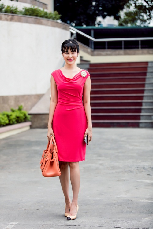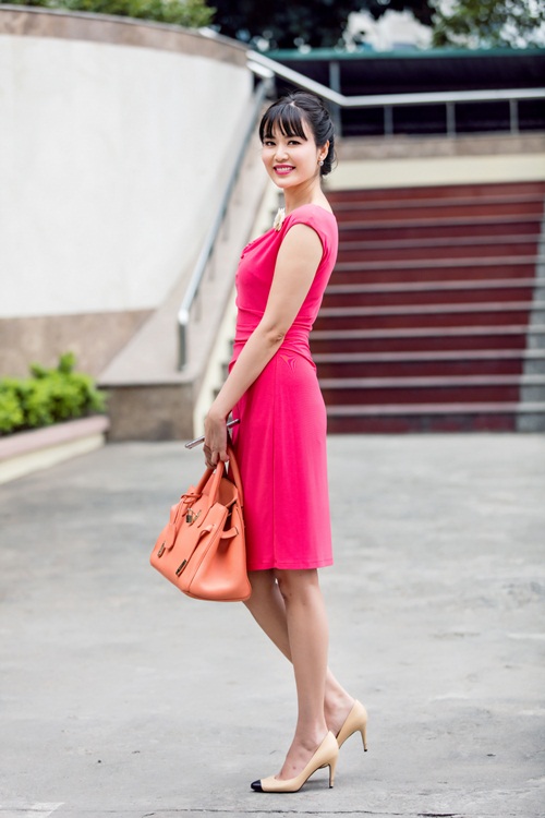 Xuất hiện tại trường quay, Hoa hậu gây thu hút mạnh với vẻ đẹp rực rỡ trong chiếc đầm màu hồng được chị phối hợp cùng túi Hermes màu cam làm nổi bật là da trắng và nụ cười toả nắng của chị. Ngoài 40 tuổi, nhưng Hoa hậu trẻ trung, xinh đẹp thu hút mọi ánh nhìn.