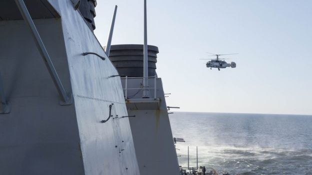Trực thăng Kamov KA-27 Helix bay gần tàu khu trục USS Donald Cook hôm 12/4. Ảnh: US Navy |