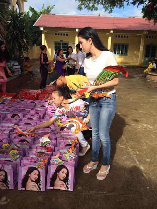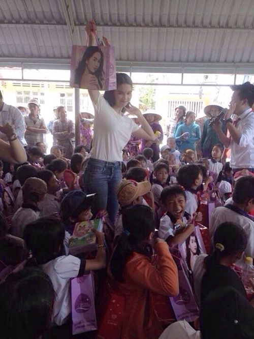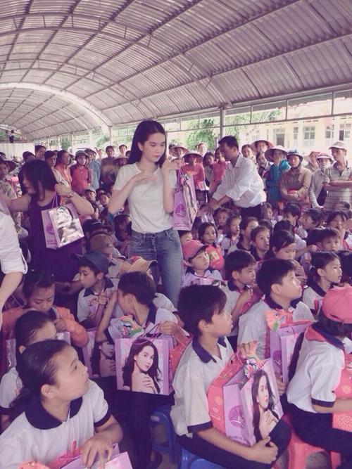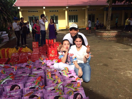 Nhân dịp tết trung thu năm nay, Ngọc Trinh ăn mặc giản dị đi Từ thiện cho các em nhỏ nhưng tất cả các túi đựng quà đều được in hình Ngọc Trinh.