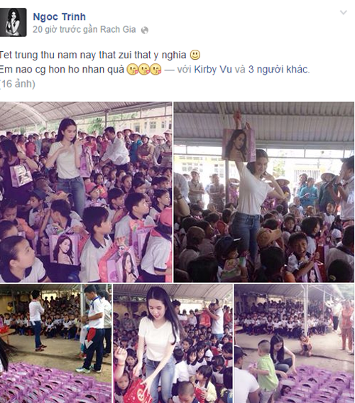 Chia sẻ trên trang cá nhân của mình với niềm vui nhỏ khi đi làm từ thiện Ngọc Trinh viết: Tết trung thu năm nay thật vui và ý nghĩa, em nào cũng hớn hở nhận quà". Nhưng điều đáng chú ý của Ngọc Trinh khi tất cả những túi quà đều được in hình của cô với bộ vai trần cỡ lớn đựng bánh bao cho các em nhỏ.