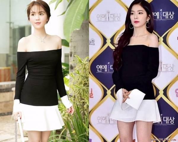 Từ kiểu dáng đến cách phối màu hai mẫu váy có độ tương đồng rất lớn. Điểm khác biệt là chất liệu vải và vùng ống tay loe. Một số sự khác biệt đáng kể khi so sánh bộ váy của Ngọc Trinh và bộ váy của một số mỹ nhân Hàn khi “đụng hàng” đã khiến nhiều người nghi ngờ rằng, “Nữ hoàng nội y” đang diện hàng “nhái”.